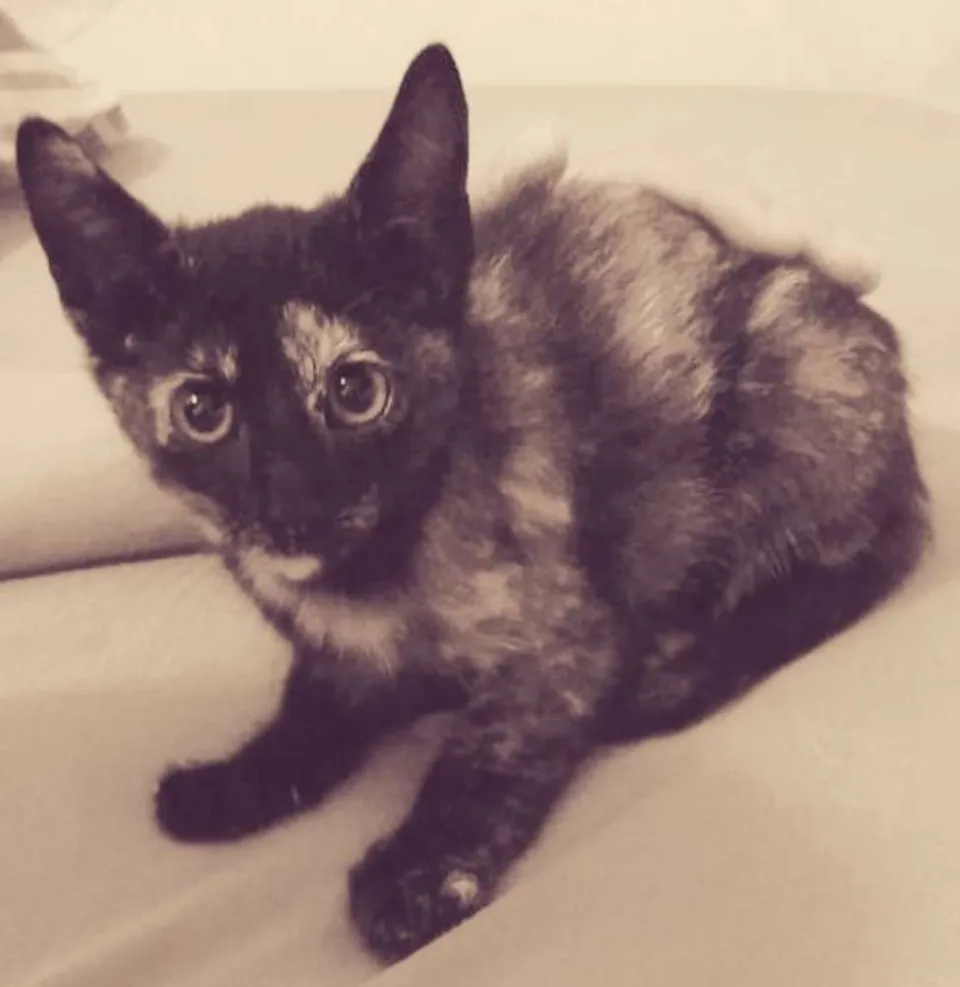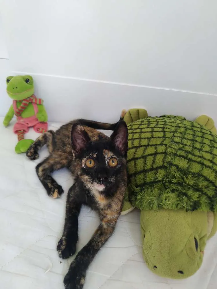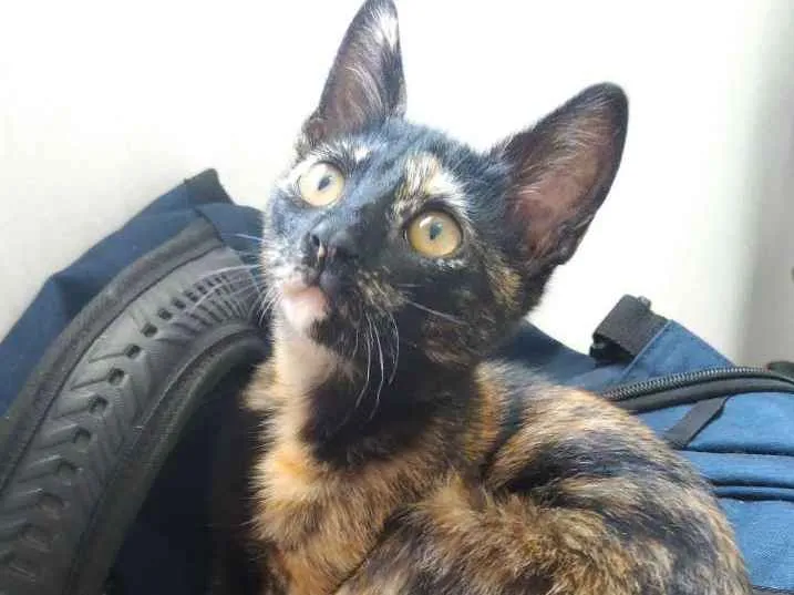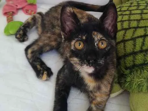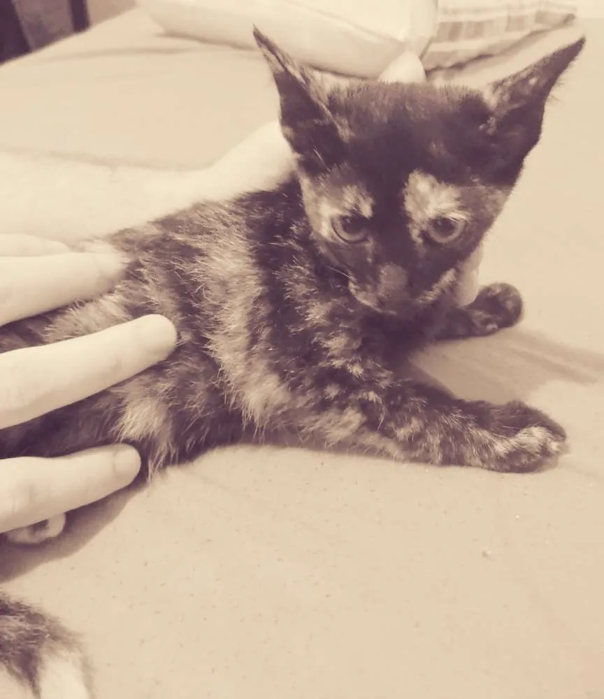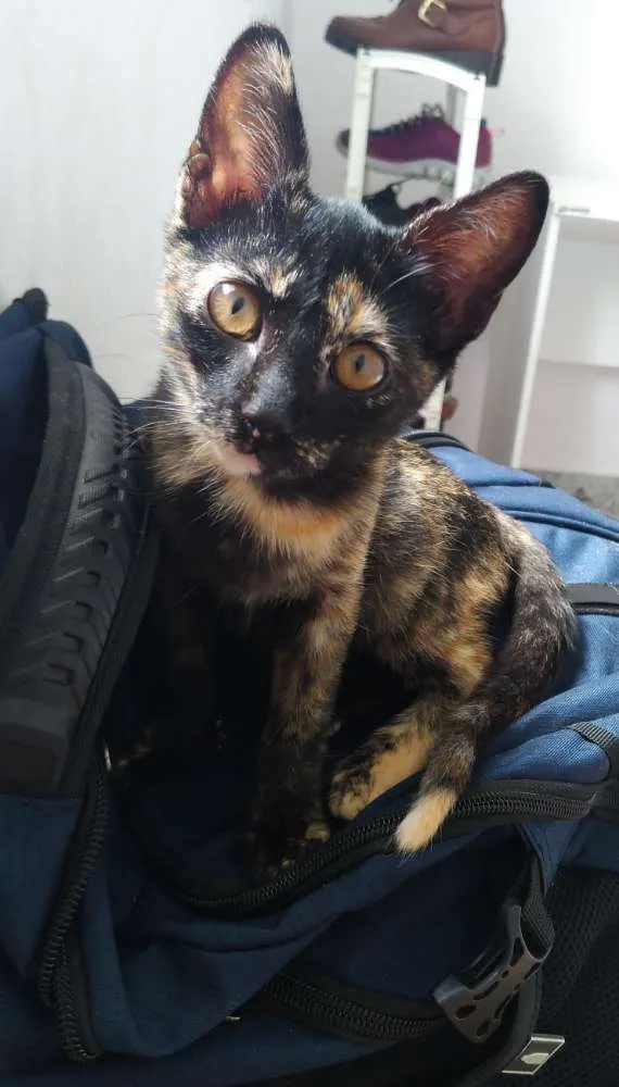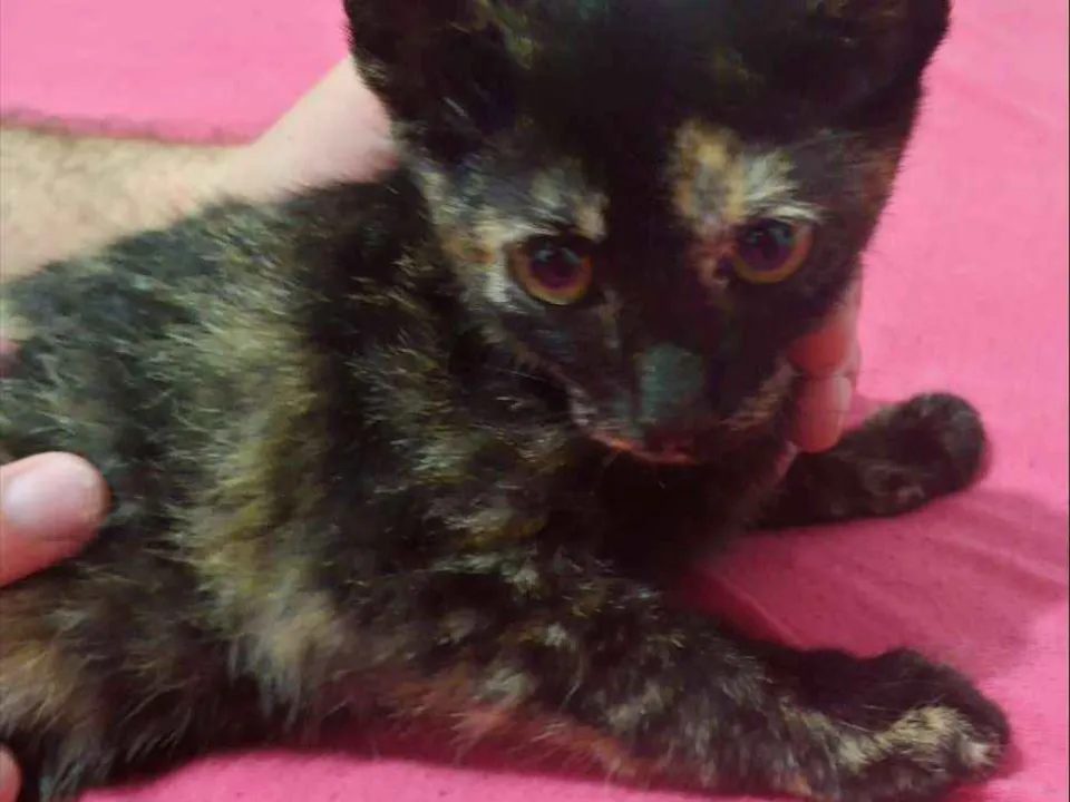 Encontramos essa gatinha fêmea no campo da rua onde moramos na Vila Vitória, em Mauá. É uma filhotinha, tem uns 2 meses. Já temos outros 8 gatos e 2 cães, é difícil para nós adotarmos mais um. Ela é manhosa e carinhosa. Já come ração. Podemos ajudar na castração.