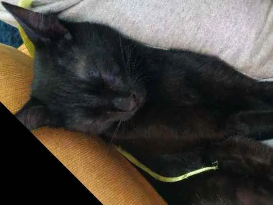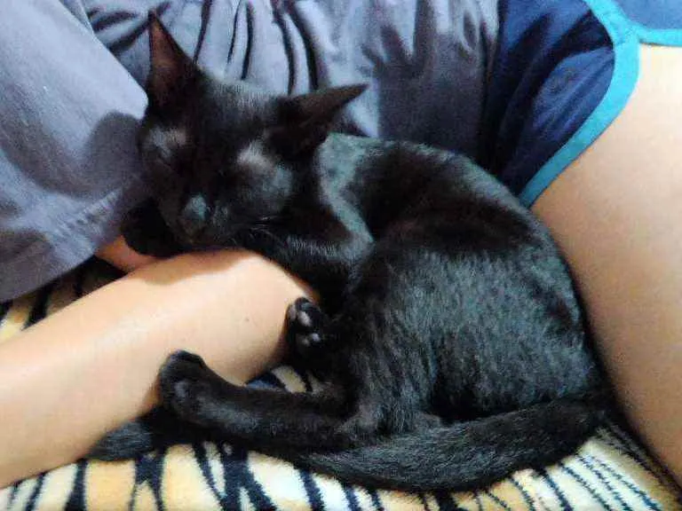 Gatinha que resgatamos em janeiro, na Vila Vitória, em Mauá. Foi castrada e vacinada. Ela gosta de estar perto da gente, é super companheira. Se dá bem com cachorros. É espoleta, adora brincar de correr e com cordinhas. Mas também gosta de colo e de dormir.