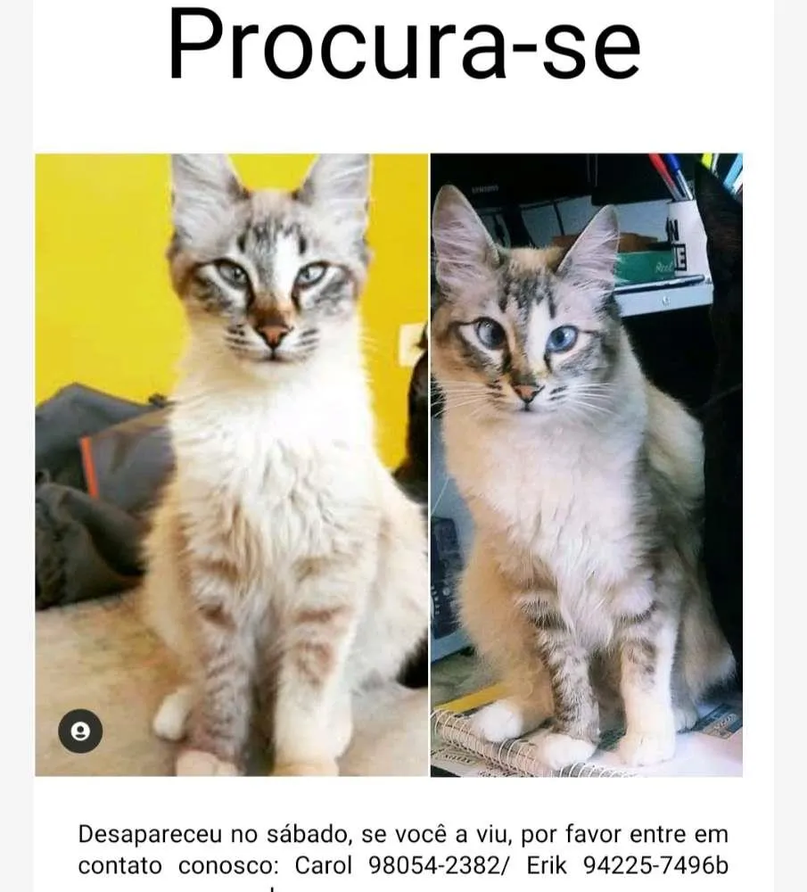 Ela tem mancha nas patinhas é bem bem peluda doce e vesga, ela caiu da sacada do apartamento no sábado 26/06/2021 e até o momento não achamos ela. Por favor nos ajudem a se alguém achou nós devolva ela não preciosa e nosso filho está chorando muito sentido a falta dela