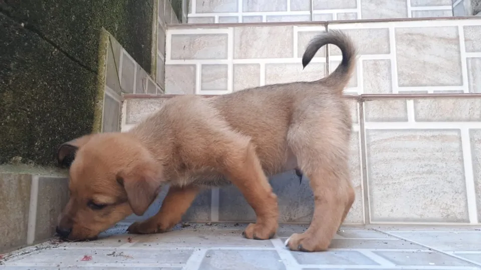 Cor amarelo claro mesclaro com marrom, porte médio, um macho.