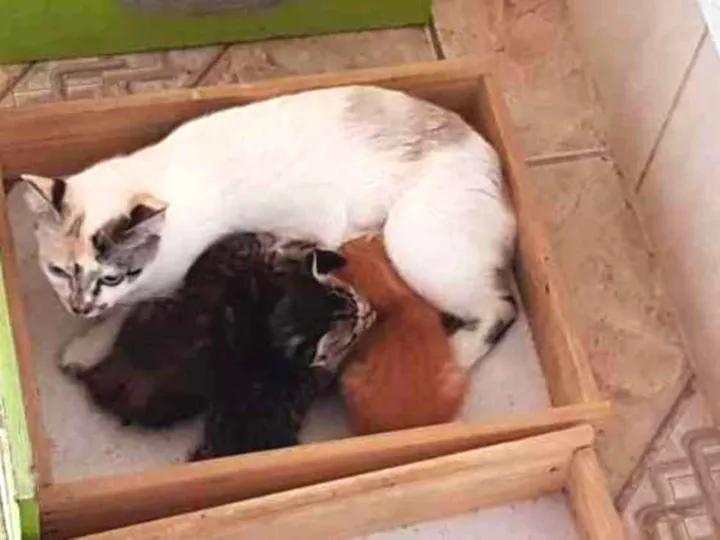 Uma gata branca malhada com seus filhotes,o motivo da minha doação, na casa onde moro atualmente os moradores são alérgicos a gatos, só o cheiro do animal já tampa a glote.