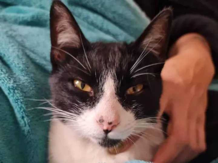 Gato de cor preto e branco, pelos curtos e olhos amarelos. Ele apareceu quando morávamos na chácara preso em uma árvore, por isso o nome rss, moramos agora em apartamento e não temos condições de ficar com ele infelizmente, temos aontodo três gatos.