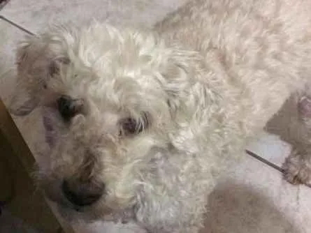 Poodle branco, macho, tamanho médio, 13 anos.