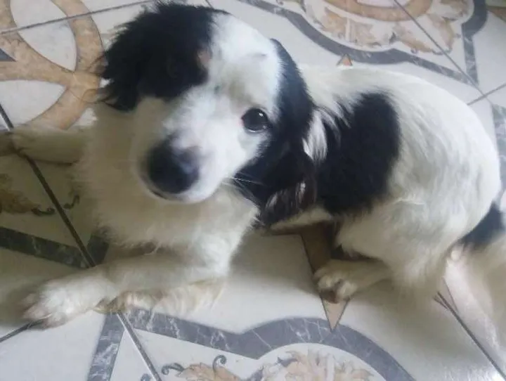 Porte médio, pelo branco com preto e pelos lisos