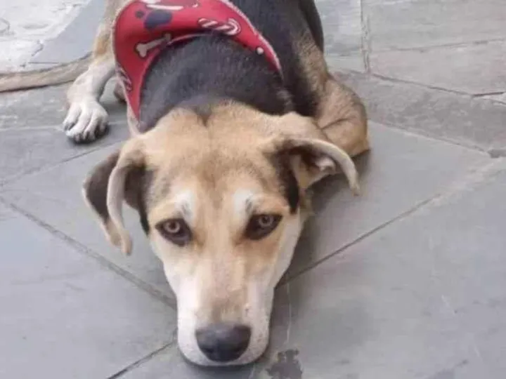 Este cão veio para o prédio na virada do dia 25/12/24 durante os fogos. Chegou assustado, passou o dia e o início da noite deitado triste, ele estava com uma gravata vermelha como se houvesse tomado banho recentemente. Procuro o dono deste cachorro ??.
