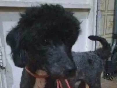 Poodle macho, pelo preto e peitoral branco, porte pequeno (5 kg), macho, 1 ano e meio aproximadamente, super dócil e calmo.