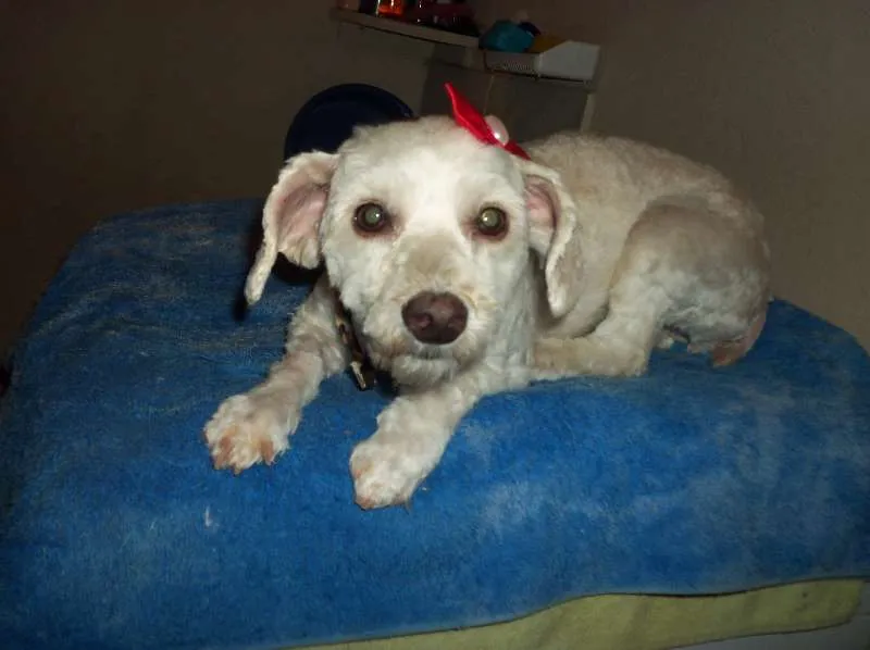 Encontrei na Av Presidente João Goulart,continuação da Rua Estados Unidos, Jd D"Abril, em frente ao condomínio de prédios da INOVA em OSASCO: uma cadelinha poodle, pequena, branca e muito assustada.