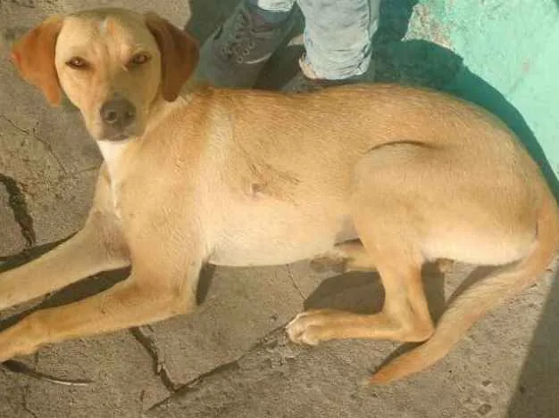 cadela media para grande pelagem amarela clara rasteira ,muito docil adora criancas