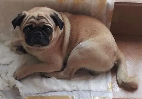 Meu cãozinho Max é um Pug bege com 04 anos e que estava com uma coleira Scalibbor de borracha na cor branca.