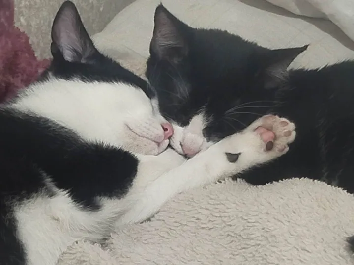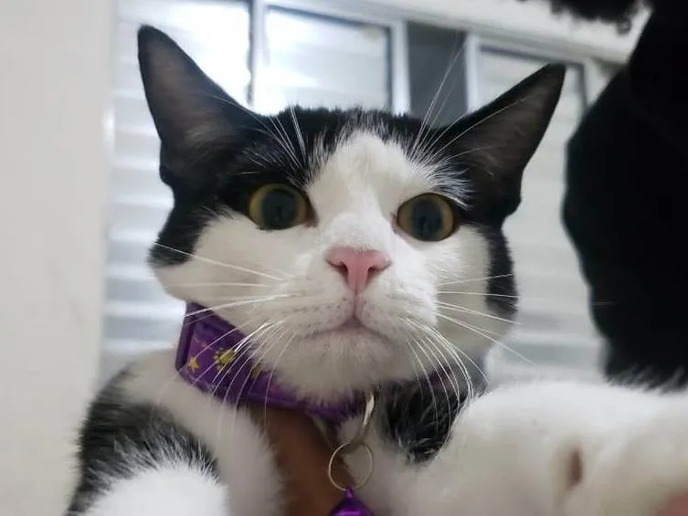 Fiz anúncio deles juntos porque estão morando juntos desde o nascimento... Caso alguém tenha condições e interesse em manter esses irmãos juntos, isso seria muito positivo e facilitaria a adaptação. O macho (coleira roxa), é dócil e carente. A fêmea (coleira azul) é brincalhona mas arisca. Os dois se relacionam bem um com o outro e com outros gatos/cachorros. Gostam de dormir e brincar juntos e de estarem próximos do tutor na hora de dormir.