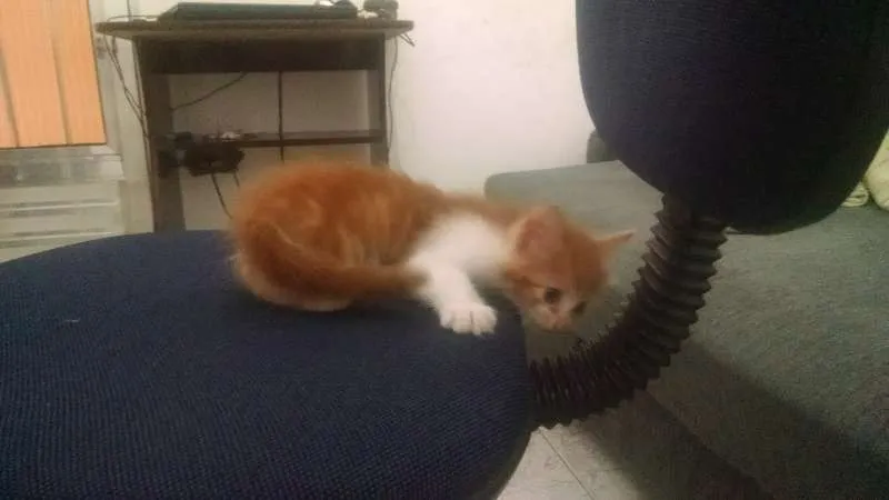 Possui dois meses e meio, come ração normalmente e utiliza a areia. Muito carinhoso e dócil.