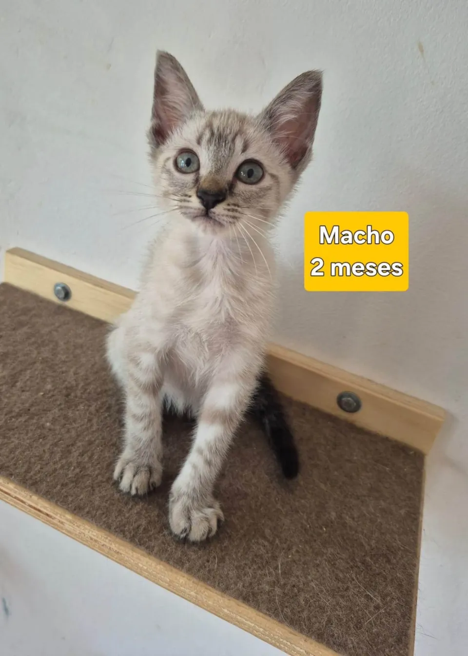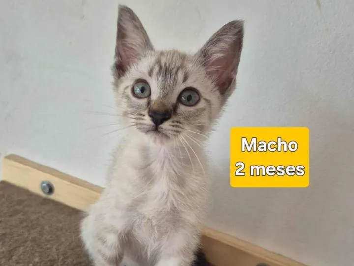 Conheça o Guto, um adorável gato macho da raça SRD-Vira-Lata, com pelagem branca e bege, 2 meses de idade.