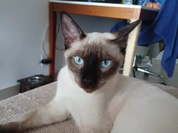 ele é um "siamês" SRD, é bem ativo, gosta de brincar com outros gatos, já está vermifugado, vacinado e castrado. ele não se importa de usar coleira. ele adora comer; serio, se fosse possivel ele comeria o saco de ração de uma vez só. está acostumado a comer sache aguado (um pacote de sache + agua até encher a vasilha).