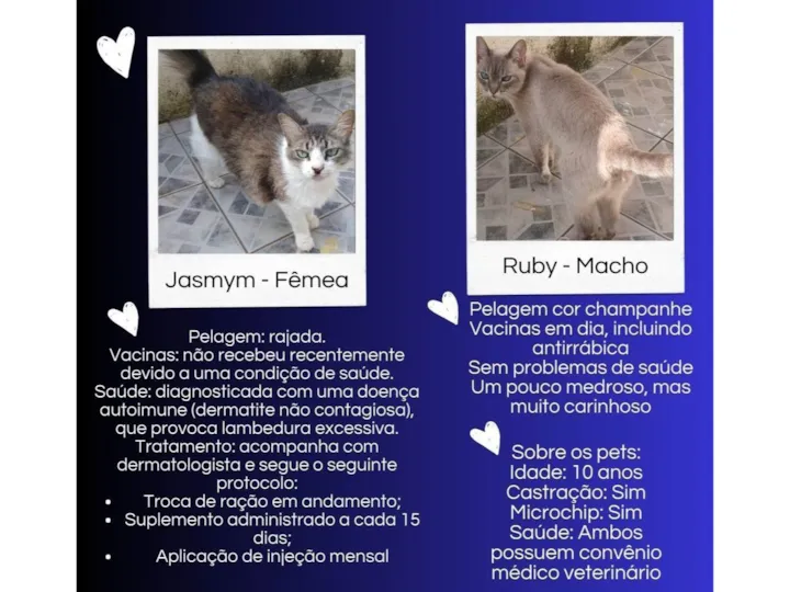 Me chamo Daigla e estou em busca de um lar amoroso para a Jasmym e o Ruby. Vou me mudar de país e, infelizmente, não encontrei uma acomodação que aceite animais. Moramos em Osasco, mas posso levá-los para outras cidades de São Paulo. Sobre as despesas: estou disposta a continuar custeando todos os gastos deles e se necessário, posso ajudar a telar a residência para garantir a segurança dos dois.