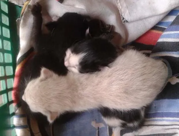Quero doar 3 filhotes de gato que nasceram há uma semana. Não tenho condições de ficar com eles, visto que já tenho duas gatas. Um filhote é branco, o outro preto e o outro preto mesclado de branco.