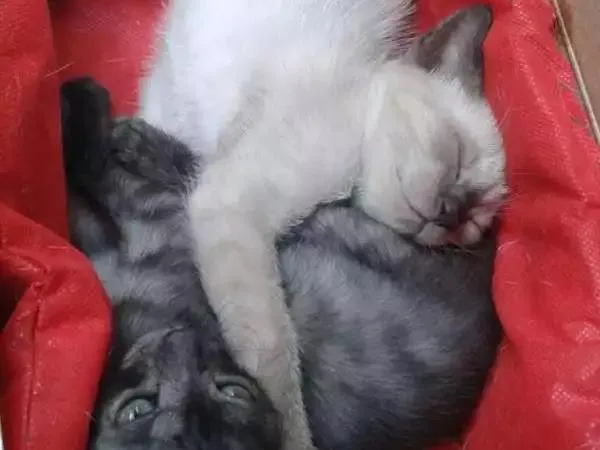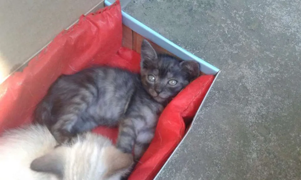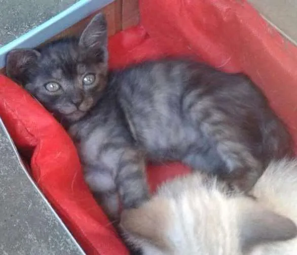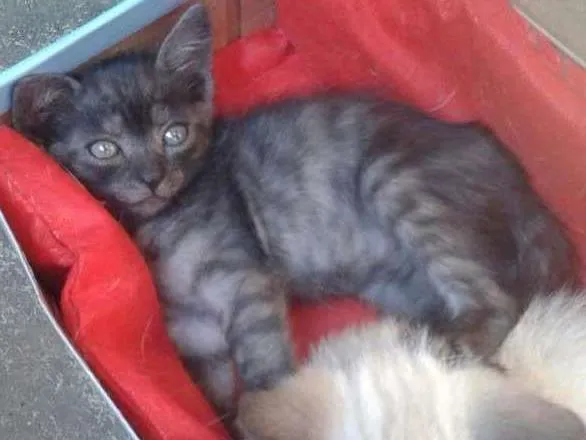 Achei dois gatinhos, mas não posso ficar com eles. Um cinza escuro rajadinho com olhos verdes e o outro cinza claro de olho azul.