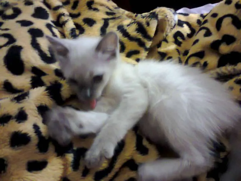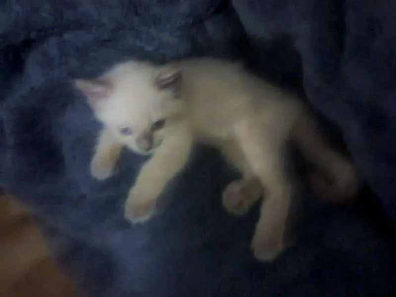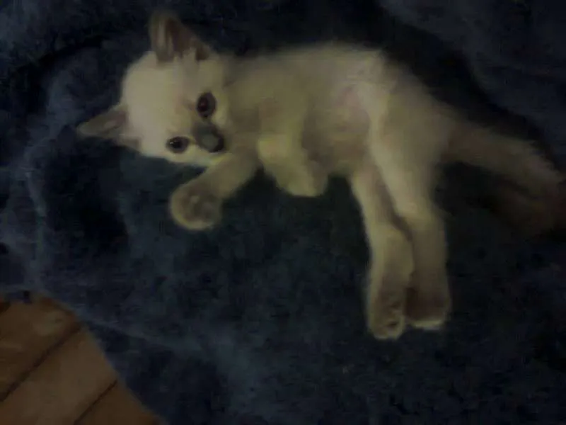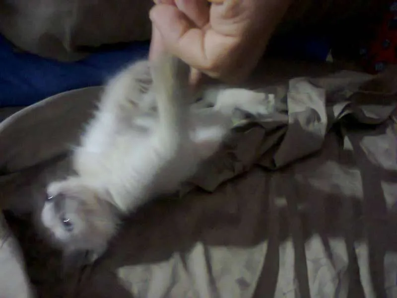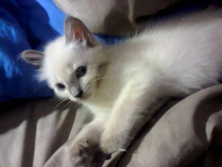 Gata pequena. Branca com as patas, focinho e rabos cinza. Tem 4 meses. Esperta e carinhosa. Vermifugada e vacinada. O dono está com câncer e a gata é quem lhe faz companhia.