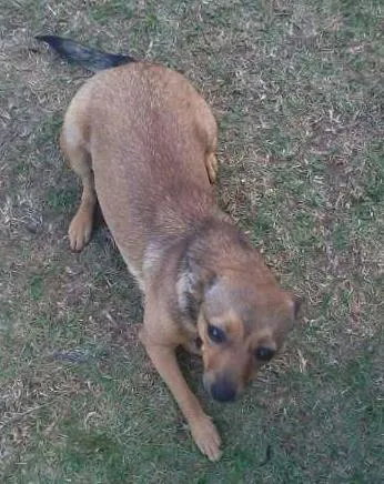Está no siu, tem pouco mais de 1 ano, é dócil com quem conhece, mas brava com desconhecidos. É pequena, pesa menos de 10kg e está com uma coleira velha de couro vermelha, com pingente de ossinho verde.
