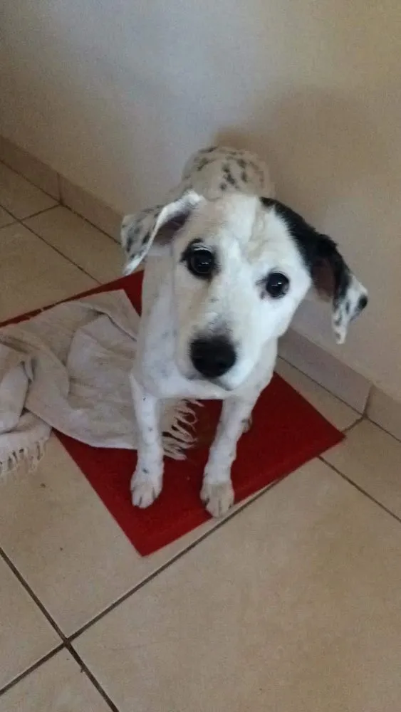 Pelo branco e com umas manchas pretas
