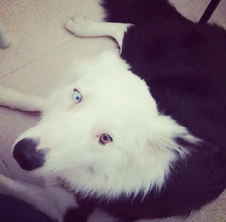 Ela tem a característica de ter um olho azul e o outro castanho, e sua pelagem é preta com branco