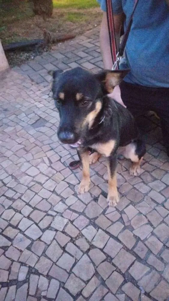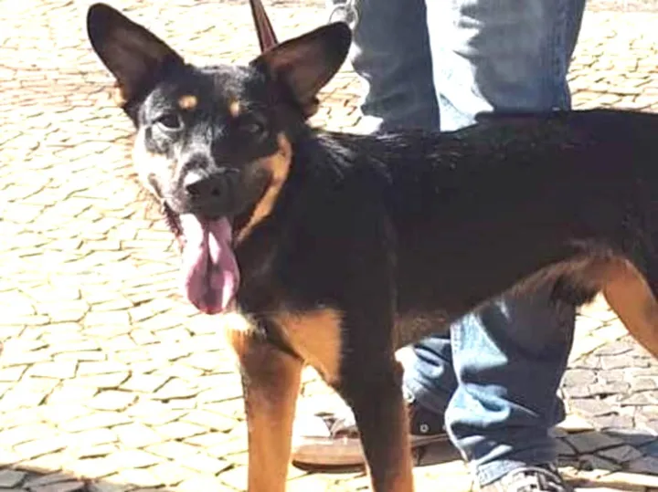 Ele é macho, tem cerca de 10 meses, 12 kg e parece ser uma mistura com Blue Heeler ou pastor.