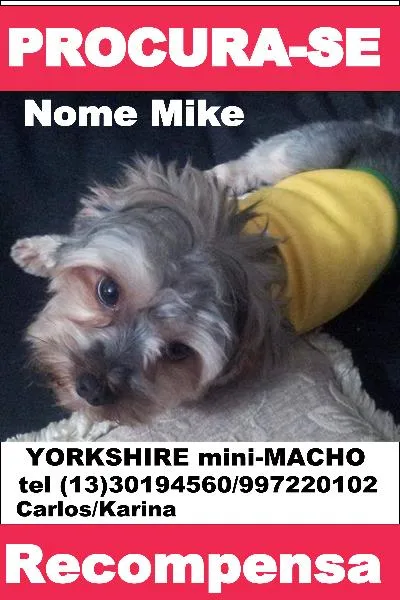 Você que no mês de julho comprou um cachorrinho da raça Yorkshire, macho, 3 aninhos, por favor verifique se suas características não são semelhantes a esse da foto , a família está em desespero, se tiver alguma dúvida entre em contato, pagaremos uma boa recompensa. dois meses já se passaram e nada do Mike, levado de dentro de casa no dia 19/07, no balneário Jussara- Mongaguá. Sei que vamos acha-lo pois a busca está muito forte, muitas pessoas nos ajudando espalharemos milhões de cartazes pela cidade e cidades próximas .