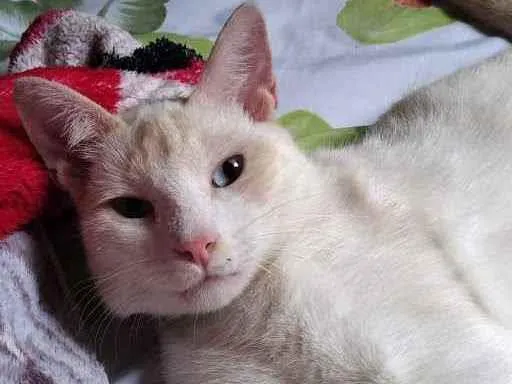 GATO BRANCO, DETALHES AMARELOS, OLHOS AZUIS, COLEIRA VERDE, ULTIMA VEZ VISTO NO BAIRRO VILA MIRIM, RUA ANANIAS BATISTA DE MENEZES.