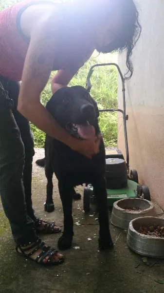 É preto e tem porte grande, muito dócil com outras pessoas mas encontrou dificuldades vivendo com outros cachorros.