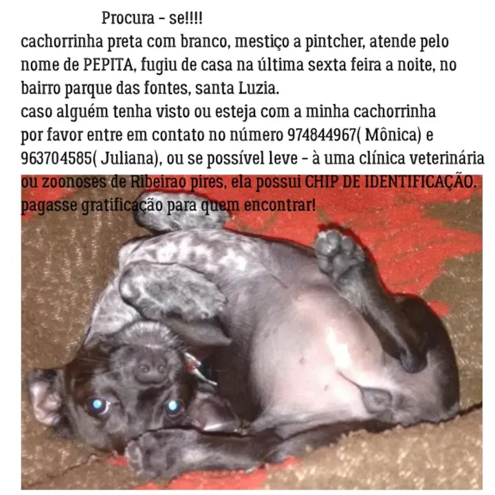 Pepita, porte pequeno, na cor preta com branco no peito e patas dianteiras, fugiu no último dia 24/12, ela possui chip de identificação, caso alguém encontre entra em com por favor.