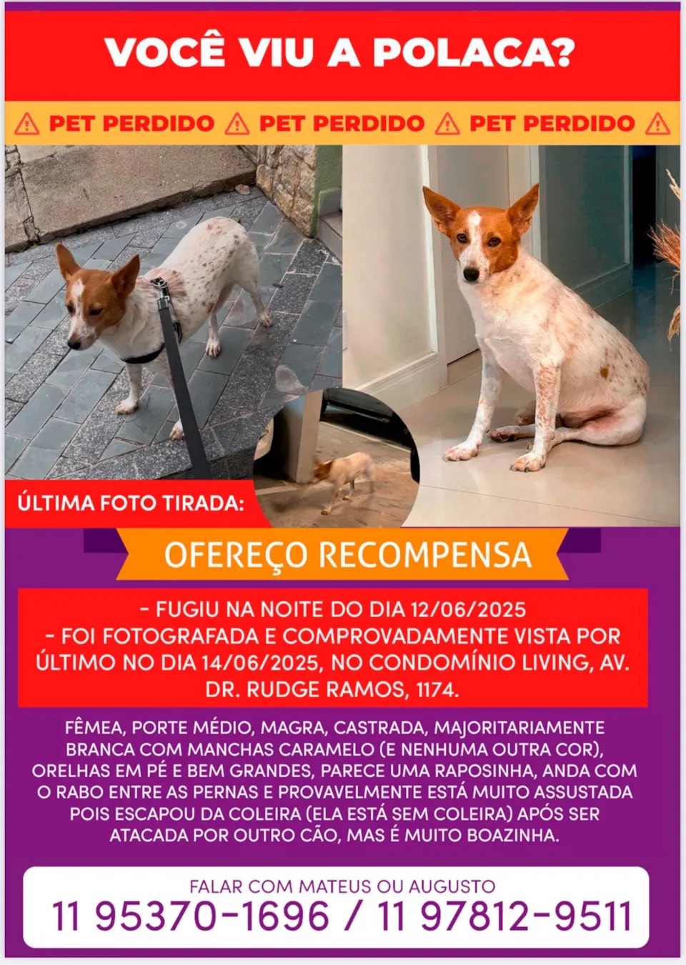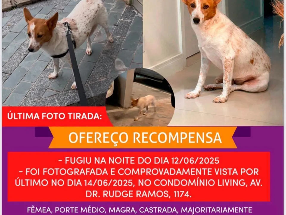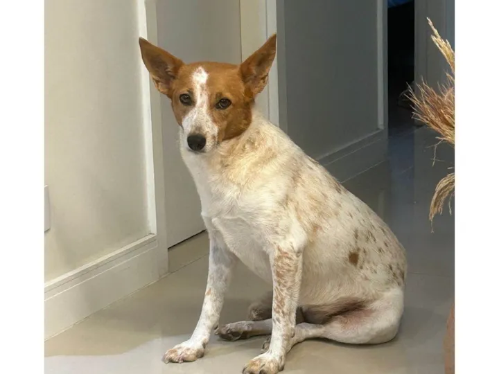 Cachorra Red Heeler. Castrada. Branca rajada de caramelo, anda com o rabo entre as pernas. Mascara caramelo nos dois olhos, (manchas e rajada somente caramelo). Parece uma raposinha. Assustada e tem medo de outros cachorros. Fugiu da cidade de São Caetano do Sul após ser atacada por outra cachorra que andava com o dono mas sem guia. Deve estar muito assustada. Foi vista e fotografada pela ultima vez no dia 14/06/25 na Avenida Dr Rudge Ramos, SBC. NÃO ESTÁ PARA ADOÇÃO. ESTAMOS PROCURANDO POR ELA.