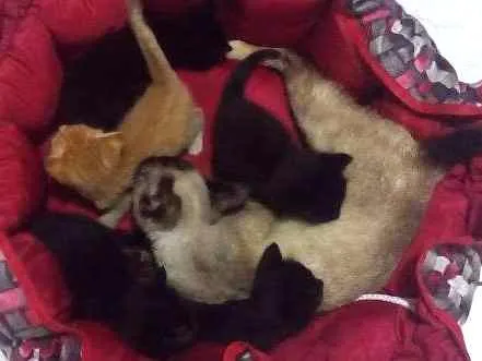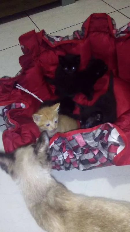 Na verdade, acolhi há pouco mais de 1 mês uma gata prenhe, ela deu cria no dia 19 de outubro. % filhotes, 4 pretos e 1 malhado alaranjado. A mãe é muito pequena, parece ter uns 6 meses e é siamesa. Não consigo ter certeza de quantos são fêmeas ou machos. Eu já tenho 4 gatos, 2 gatas e 2 gatos, e eles não se adaptam a outros bichinhos, além disso, não tenho condições de ficar com 10, nem com a gata-mãe, pois meus gatos têm medo dele, por incrível que pareça. Por isso estou procurando interessados em adoção, mas quero ter certeza de que irão para lares de pessoas que amam animais.