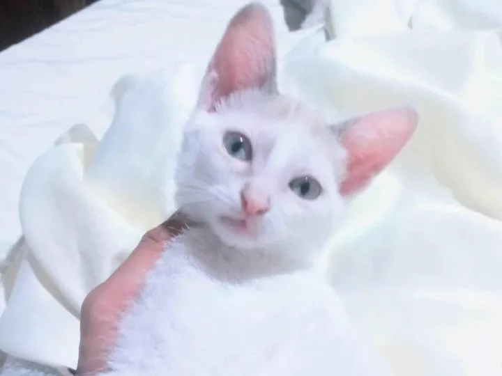 Filhote de 90 dias pelagem Branca calda cinza manchinhas Claras ao pé da orelha olhos água marinha