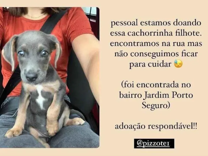 Foi encontrada essa cachorrinha filhote no bairro Jardim Porto Seguro - Ribeirão Preto. Infelizmente não consigo ficar com ela pois já tenho um cachorro de porte grande, estou em busca de uma adoação responsável para ela e urgente!!
