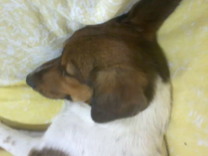 Este cãozinho ele tem o corpo branco com manchas marrons no corpo e sua cabeça lembra o chapéu do chaves.