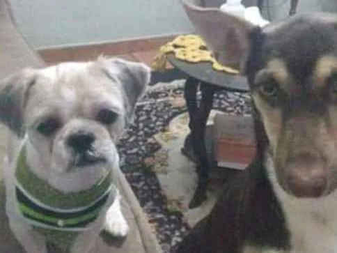 São dois cachorros macho , um Shitzu outro raça indefinida , Shitzu branco tosado rabo peludo cor branco orelha cinza , o outro cor chocolate escuro olhos Claro , perdidos próximo ao cantinho do céu rua apeninos TB próximo a via norte