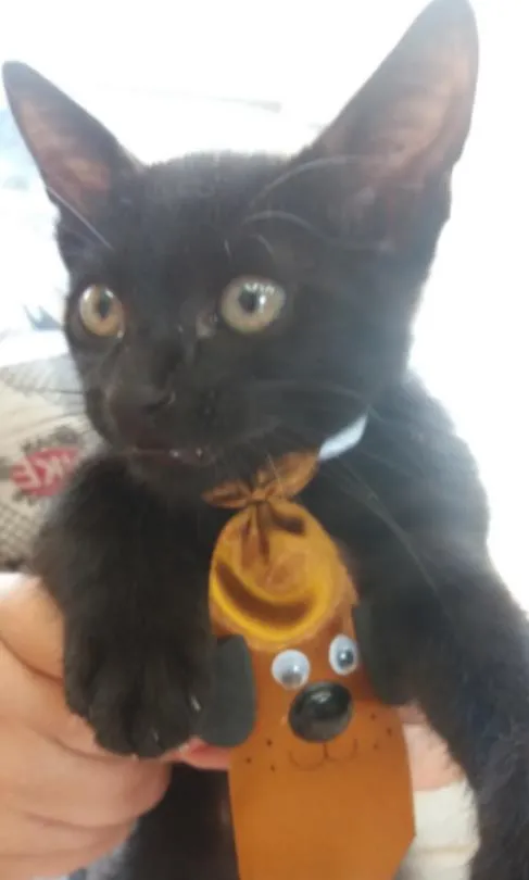 É um gatinho muito esperto, come bem ração seca, já usa caixa de areia para as necessidades. Adora brincar com objetos e não dispensa um colo.Tem aproximadamente 45 dias e é macho. Em busca de um lar amoroso e responsável.