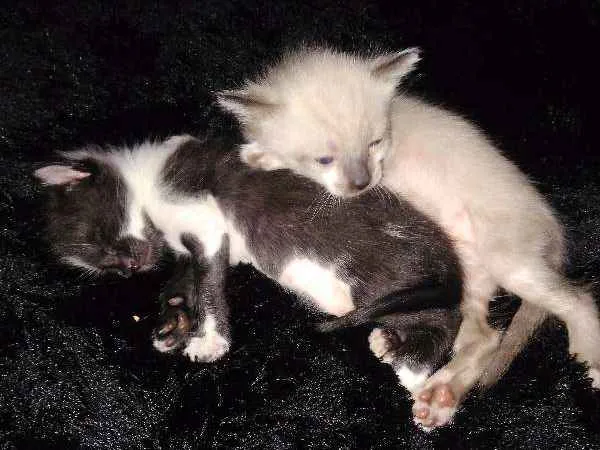 São 3 gatinhos, a pretinha é fêmea (Acabamos a chamando de Diana), e dois são machos branquinhos. Um dele parece siames e é mais cinzento, e o outro é bem branquinho e tem manchas caramelo nas costas.