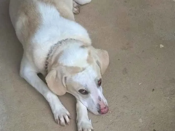 Luigi tem aproximadamente 04 anos, mesclado branco e bege, pelo curto, vira lata, castrado, vacinado. Muito brincalhão e carinhoso