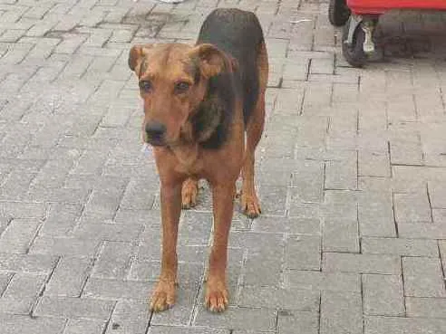 Cachorra de porte grande, muito dócil, castrada, de pelagem curta marrom e preta, está perdida, ela é muito boazinha e ultimamente tem ficado muito triste na rua.