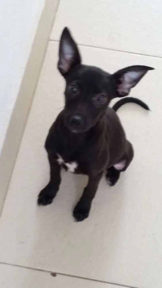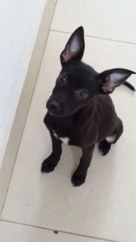 Sou filhote ainda, mas provavelmente vou ter porte médio. Tenho pelos curtos e pretos, orelhas pontudas e um lindo olhar que demonstra todo meu amor.