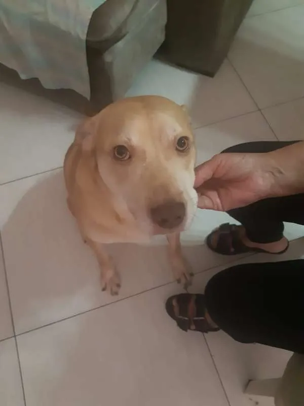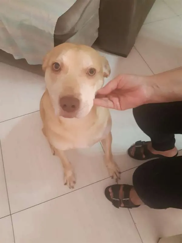 É um cachorro de grande porte, em torno de 1 ano, lindo, mistura de Pit Bull, super dócil, carinhoso e brincalhão.