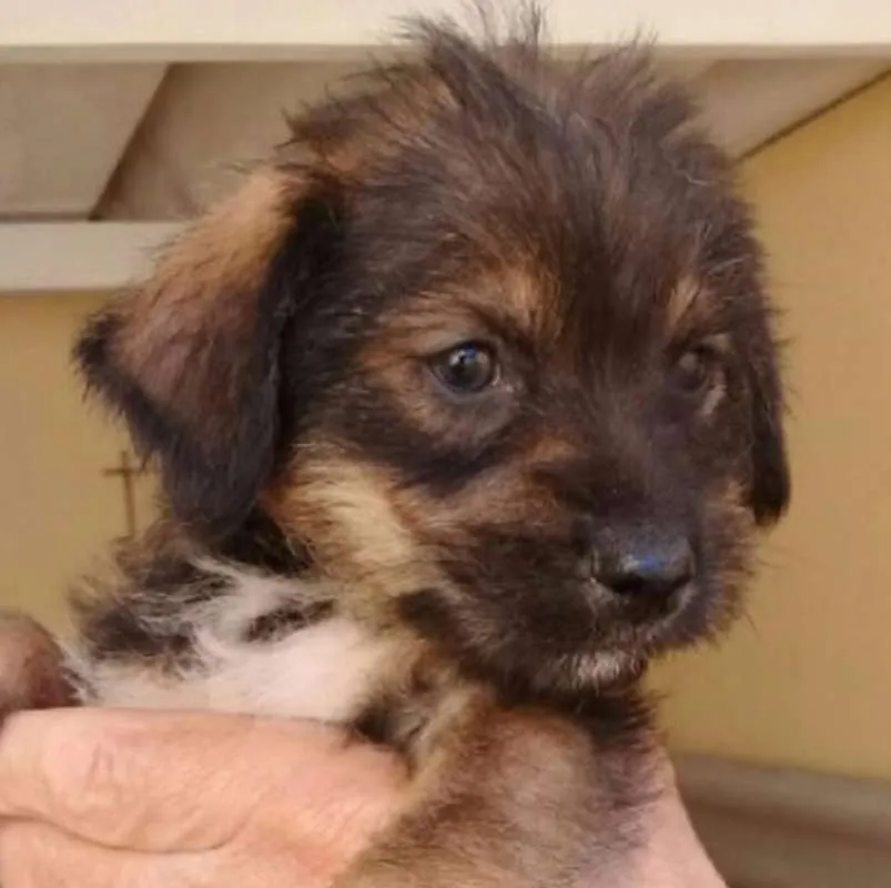 Tem 45 dias. Porte de pequeno à médio. Se dá super bem com outros animais.