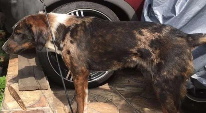 ele aparenta ter entre 6 a 9 meses, grande, e muito mansinho