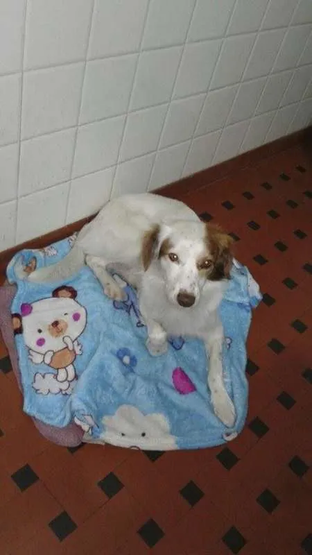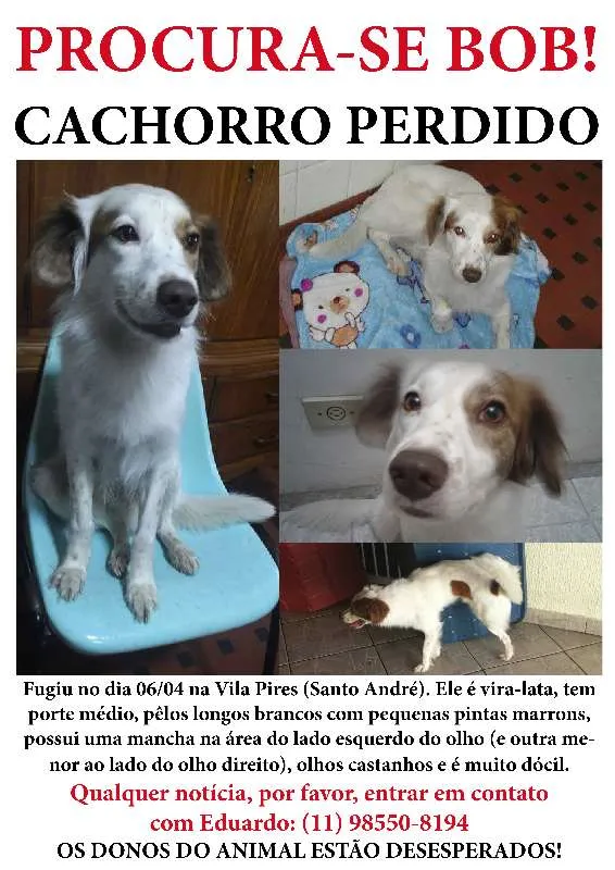 Ele é vira-lata, tem porte médio, pêlos longos brancos com pequenas pintas marrons, tem uma mancha na área do lado esquerdo do olho (e outra menor ao lado do olho direito), olhos castanhos e é muito dócil. Ele não costuma sair de casa, e por isso deve estar muito assustado e sem rumo.