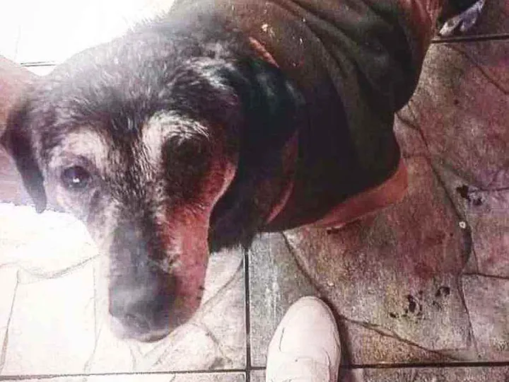 Cão idoso preto grisalho, rostinho e patas mais claras (branquinhas), surdo e com pouca visão, manca um pouco e tem uma bolha na pata de trás. Cão dócil e estava de coleira azul.