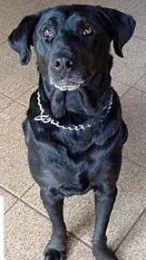 Suria - SRD, cor preta, semelhante a um labrador, mais ou menos 5 anos, sem rabo. Provavelmente está com a coleira da foto e pode estar mancado, por conta de um problema na pata da frente.
