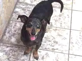 Desapareceu próximo ao Sonda de Santo André, bairro Bangú. Possui um olho azul e outro castanho e uma marquinha na orelha. Não sabemos ao certo a idade, pois foi adotado (há 3 anos), porém já é um cão idoso. Sua pelagem é tricolor, prevalecendo a cor preta.