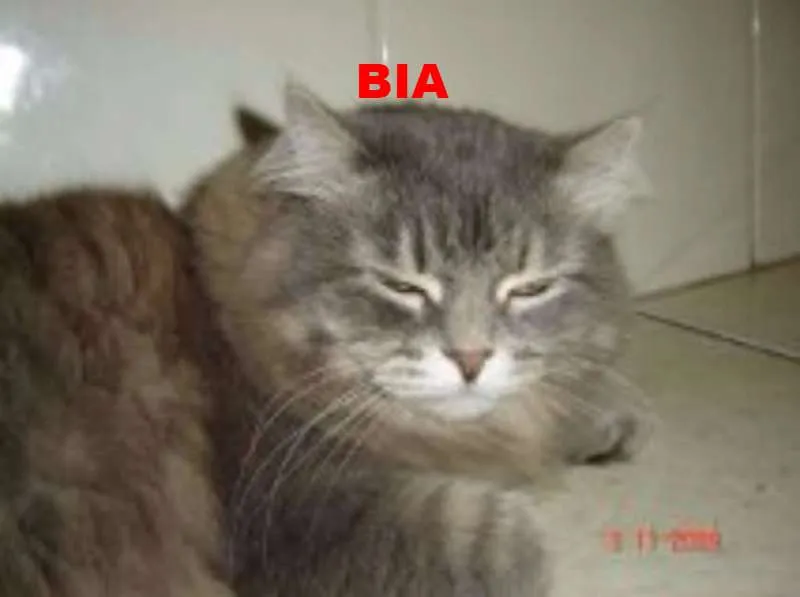 Bia: Mestiça Persa/Angora, cinza-tigrada, 13 anos