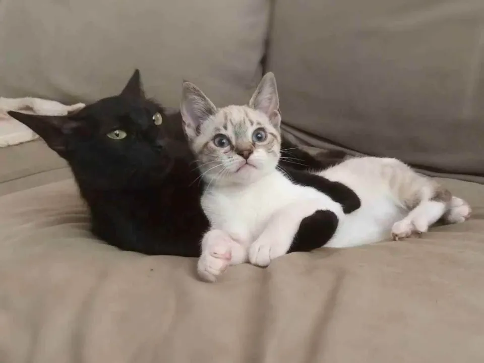 Norah é uma linda gatinha adolescente de sete meses, carinhosa, linda, castrada e vermifugada e Eddie e um fofíssimo gatinho de 3 meses que ela adotou como filhinho! Eddie é vermifugado e tem castração garantida a partir de 4 meses.