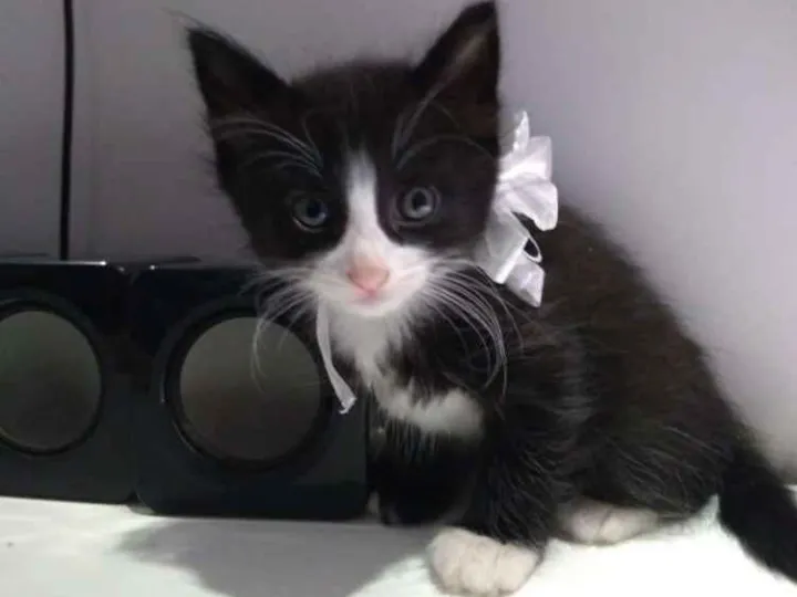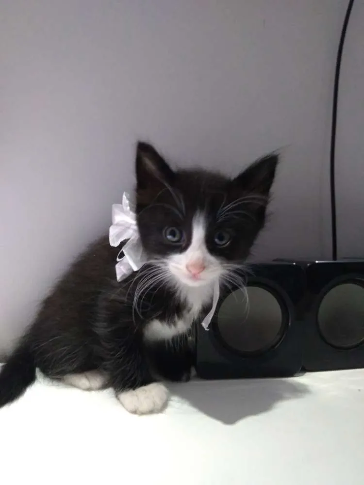 Gatinha super amorosa de pelagem media preta e detalhes de pelo branco e olhos amarelo.